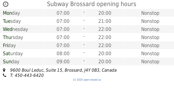 It is also possible to : Edit these OPENING HOURS of Restaurant Subway In Brossard, 9600 Boul Leduc, Suite 15,